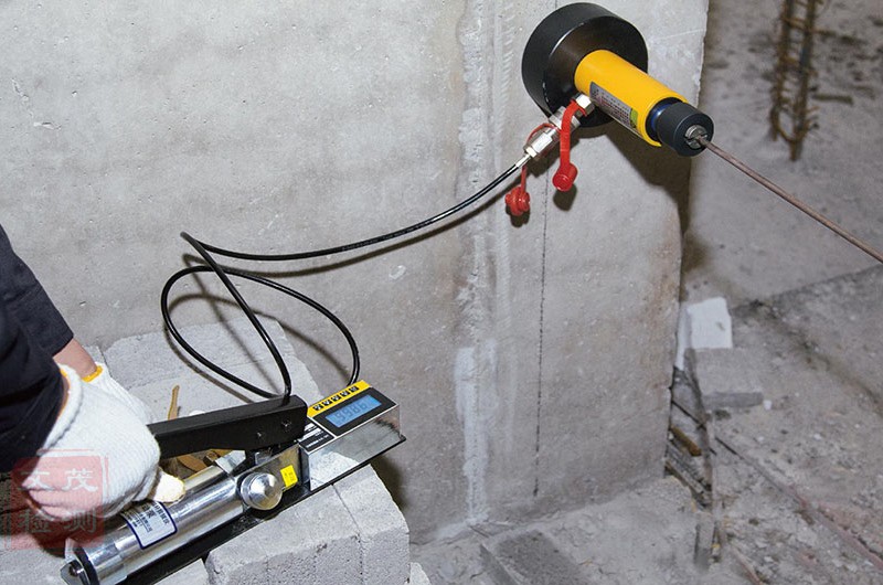 一般植筋72小時后,可采用拉力計(千斤頂)對所植鋼筋進行拉拔試驗。為減少千斤頂對錨筋附近混凝土的約束,下用槽鋼或支架架空,支點距離≥max(3d,60mm)。然后勻速加載2∽3分鐘(或采用分級加載),直至破壞。破壞模式分為鋼筋破壞(鋼筋拉斷)、膠筋截面破壞(鋼筋沿結構膠、鋼筋界面拔出)、混合破壞(上部混凝土錐體破壞,下部沿結構膠、混凝土界面拔出)3種,結構構件植筋,破壞模式宜控制為鋼筋拉斷。檢測依